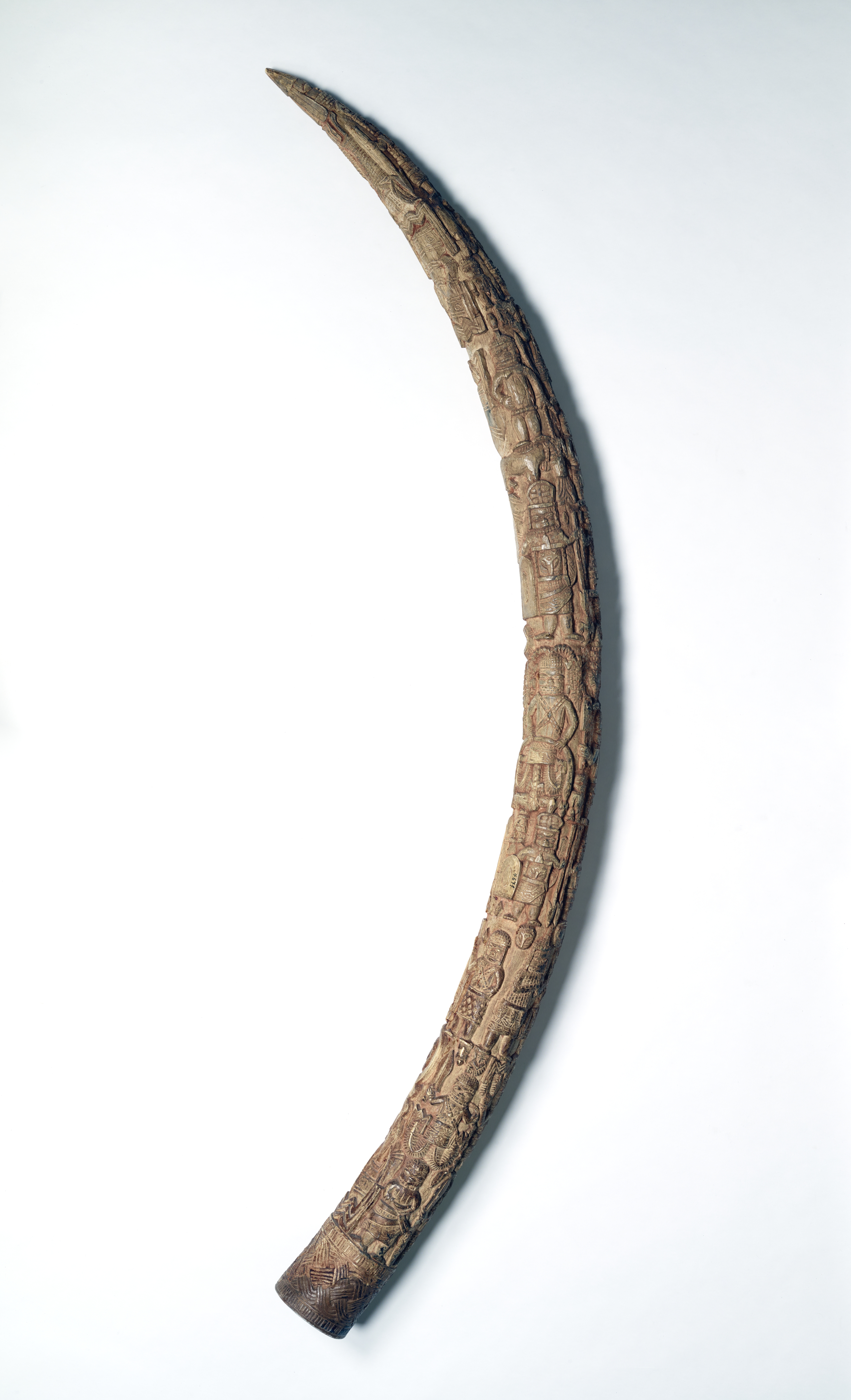 | Description | The elephant was probably the most important royal animal in large parts of Africa. In Benin, the king had an economic monopoly on ivory and received one of the tusks from each animal hunted. They were considered charged with spiritual power and could only be touched safely by certain dignitaries. This one is richly carved and comes from the royal palace. Among other things, it depicts the fish-tailed King Ohen traveling into the realm of the water god Olokun, pulled by two crocodiles. It fits that the tusks were also considered a symbol of the court of Olokun (the god of water, wealth and beauty), who resides in the otherworld like the Oba (king) in this world. Text: Dietmar Neitzke. |