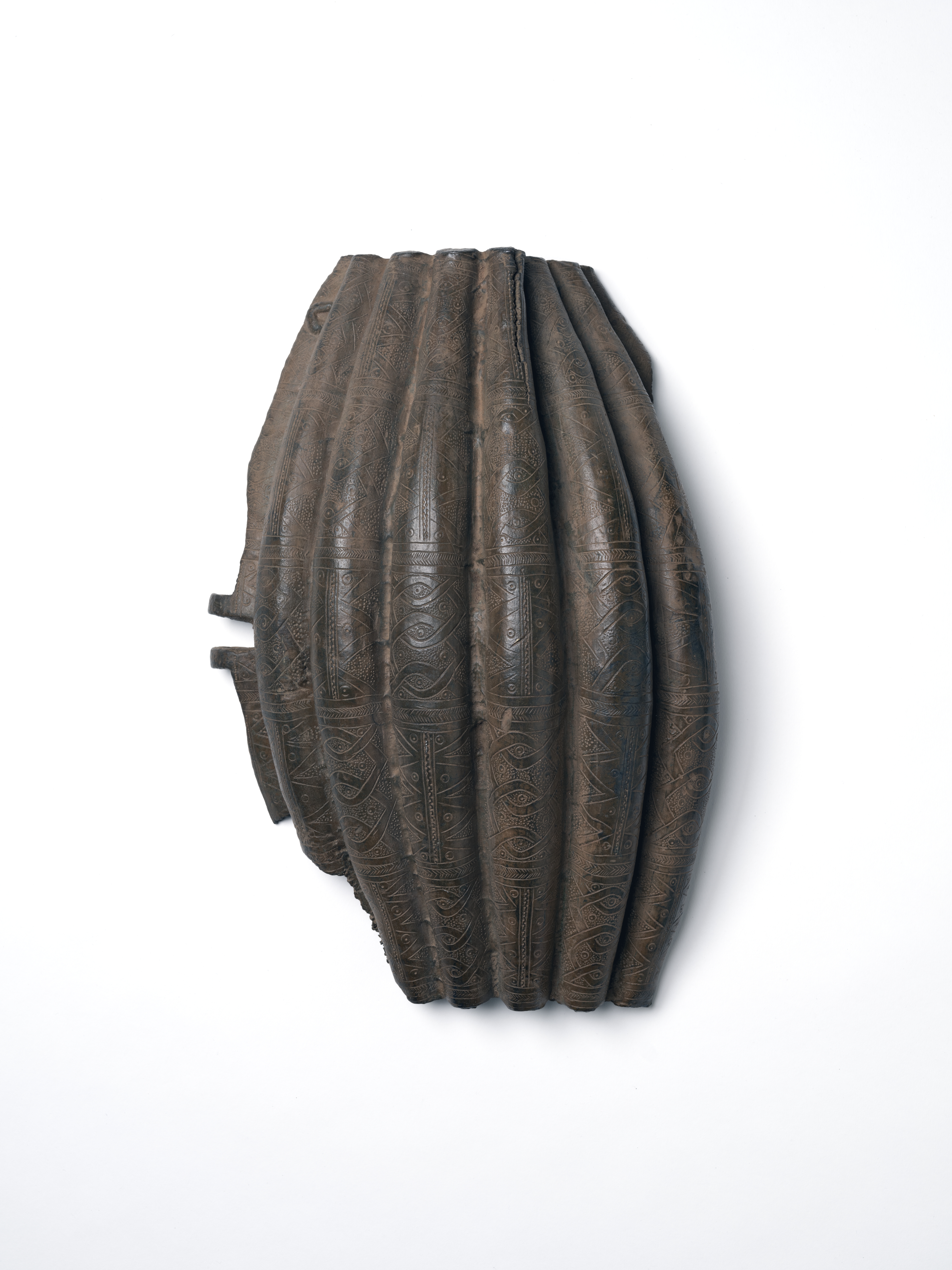 | Description | This ornamental ornament of yellow cast iron was possibly attached to the outer wall of the royal palace. The "Walls of Benin" not only separated the palace from the residential quarters of the capital, but extended from it as a network of earthen ramparts with a total length of about 16,000 km through the empire. Text: Dietmar Neitzke. |