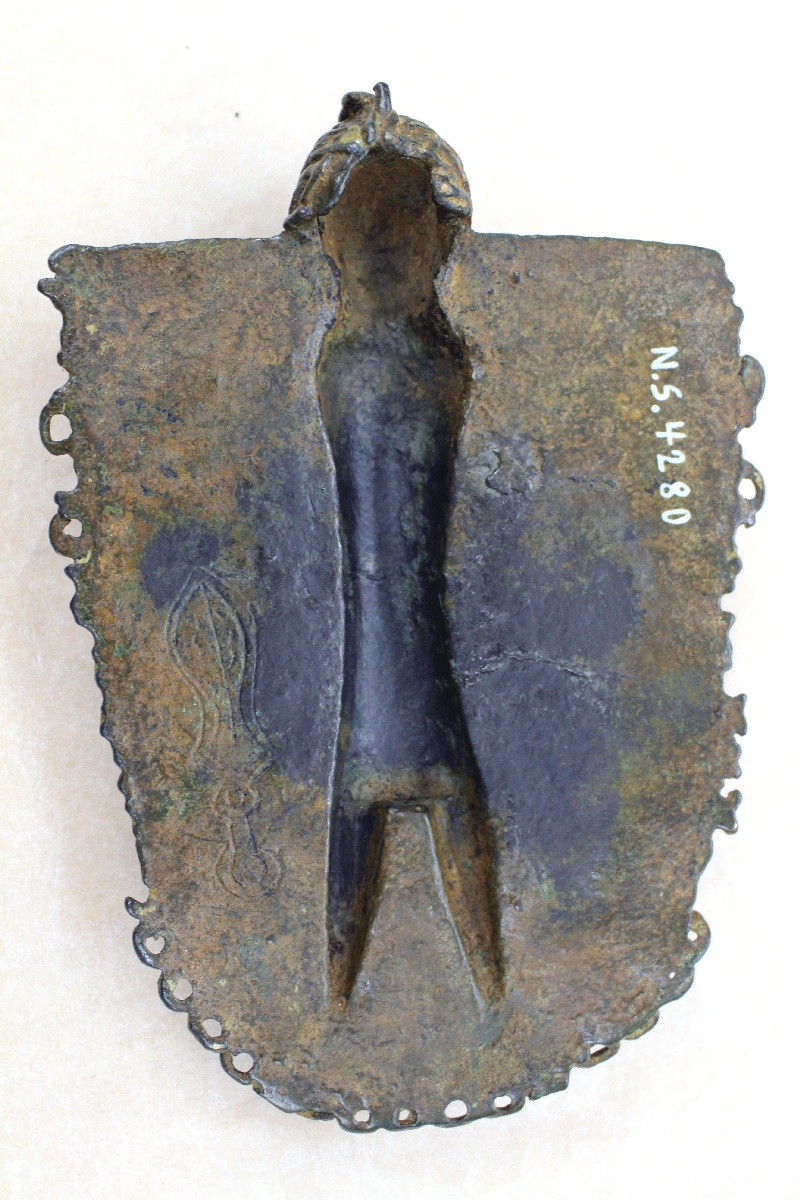 | Description | Shield-shaped, on it woman with rectangular object in her right hand. Eyelets around the edge partially broken off. "Pendant plaques are worn suspended from the waist. ... All are shaped in the form of a shield and rise at the top centrer, to form a largish suspension eyelet. All have a border of eyelets to which crotals were attached. Five types can be distinguished. .. In the third type a female figure, probably that of a queen mother, is represented wearing strands of beads crossing on the chest and a coral bead cap. .. the figure is shown holding up a square object in the right hand (mirror?) .(Dark, 56) PUBL Kat. 1975: Abb. 9 LIT Pitt-Rivers. 1976: pl. VIII, 43, 44 Dark 1962: the Art of Benin. Chicago. Abb. 287/8, p. 56f |