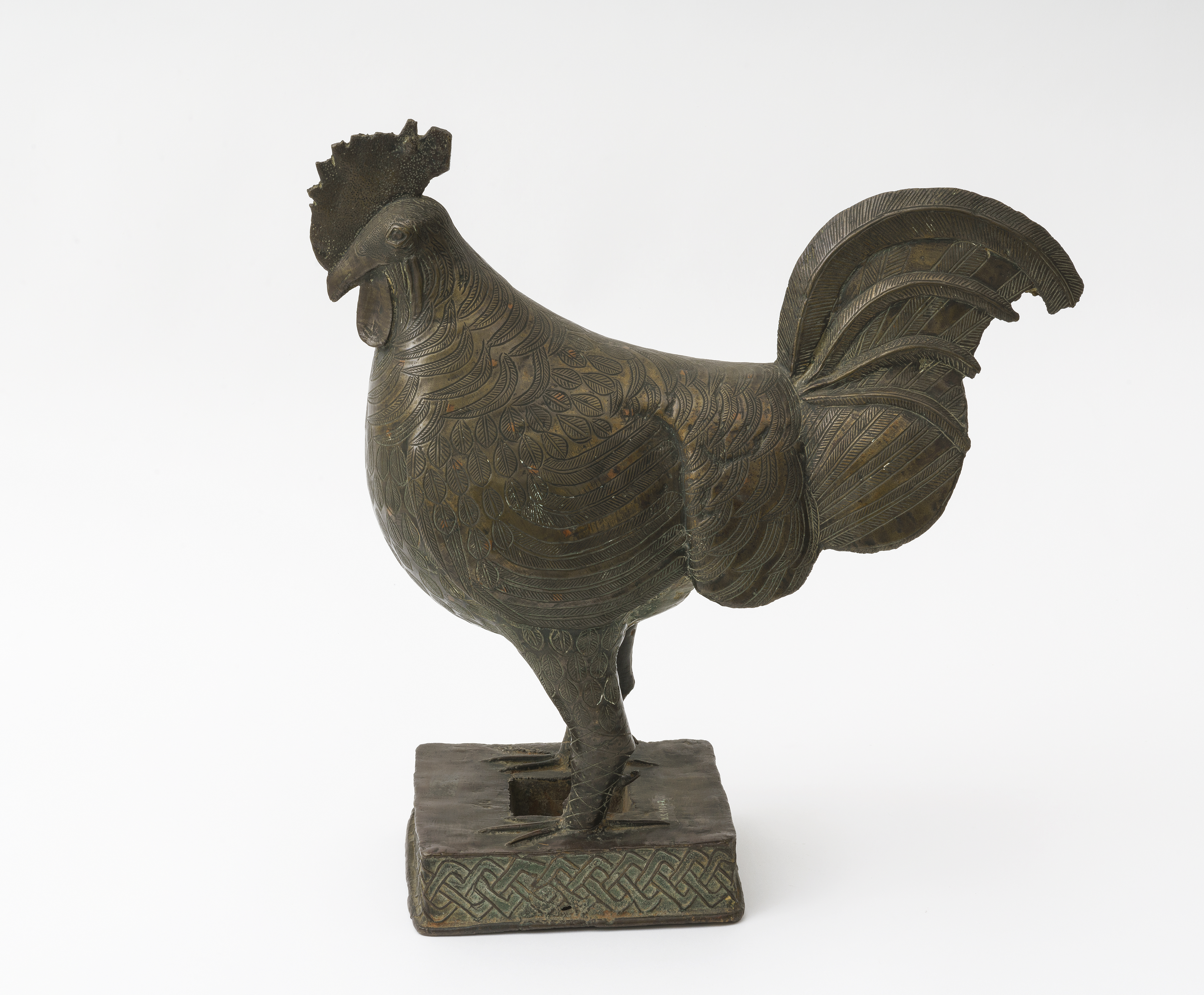 | Description | Copper spots. Casting defects on the right wing and comb. Tail feather broken off during casting. Large opening in the back. Interior: Ventral part massively filled. 3 toes & spurs. Braided band motif around base edges. "Bronze cocks are used to decorate the shrines of queen-mothers. In some households particularly those of people of high rank, there is an altar to the mothers of the living and past household heads, decorated with uxurhe .. and wooden images of fowls. (Bradbury) "Two bronze female heads, a cock and an altar piece are for the cult of the king's mothers (i.e. his own mother and those of the preceding kings, from whom he descends in the direct male line.). These pieces are all of the Late Period, the finest and earliest being the cock, which may date from the reign of oba Eresonyen (about 1750)." Fagg, 20 PUBL Kat. 1975: Abb. 6 Rachewiltz 1960: Abb. 21 LIT Dark 1982: ill. 3 und 5 (Leiden) Gall 1962: Abb. 6, 59 Dark 1962: The Art of Benin Fagg 197=: Divine Kingship in Africa. London. pl. 13, p. 20 |
