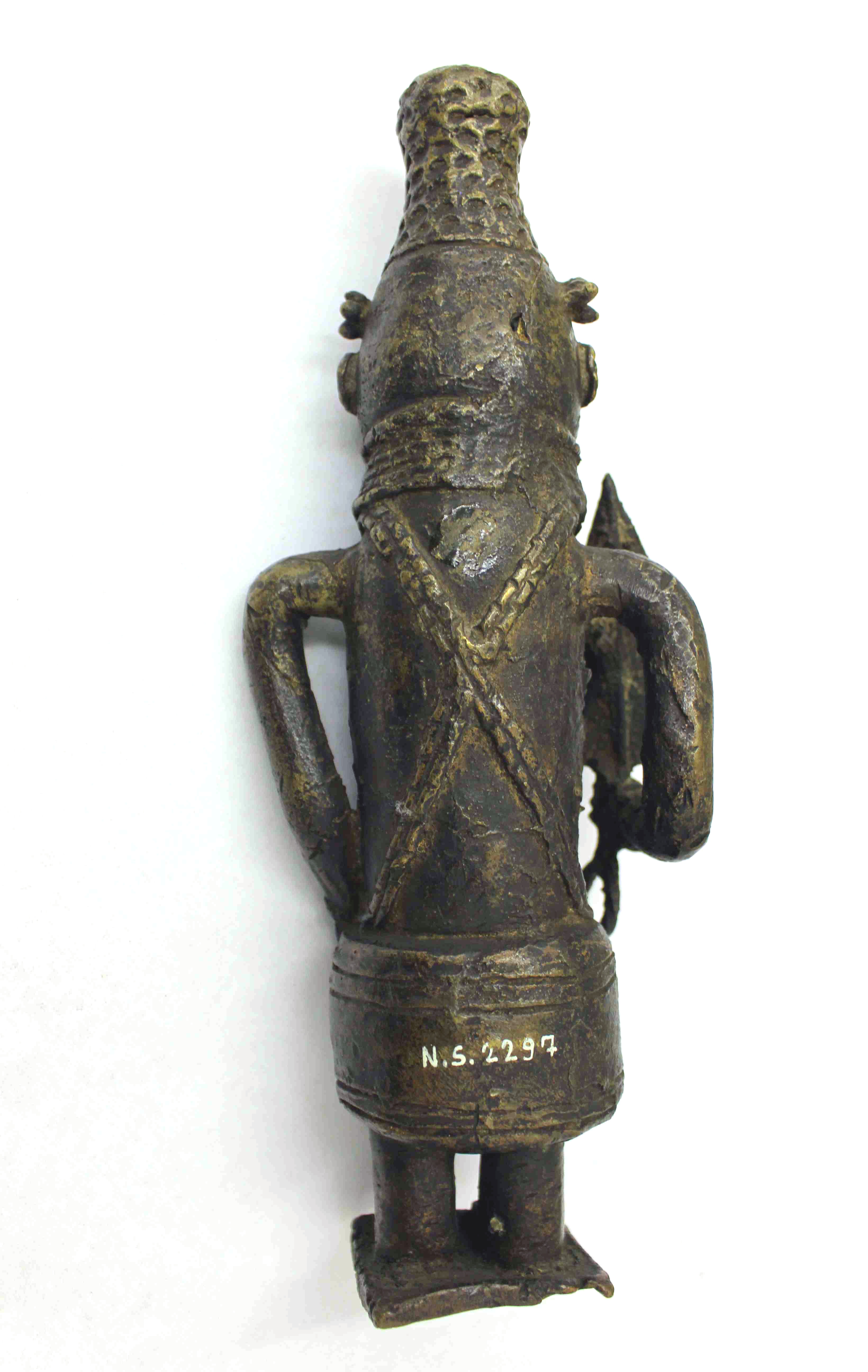 | Description | Standing, holding ceremonial sword. Coral net hood and neck ornament. Diagonally crossed chest cords. Wrapping cloth. Poorly filed casting. Casting defects at base and back of head. LIT Dark 1982: ill. 20/22 |