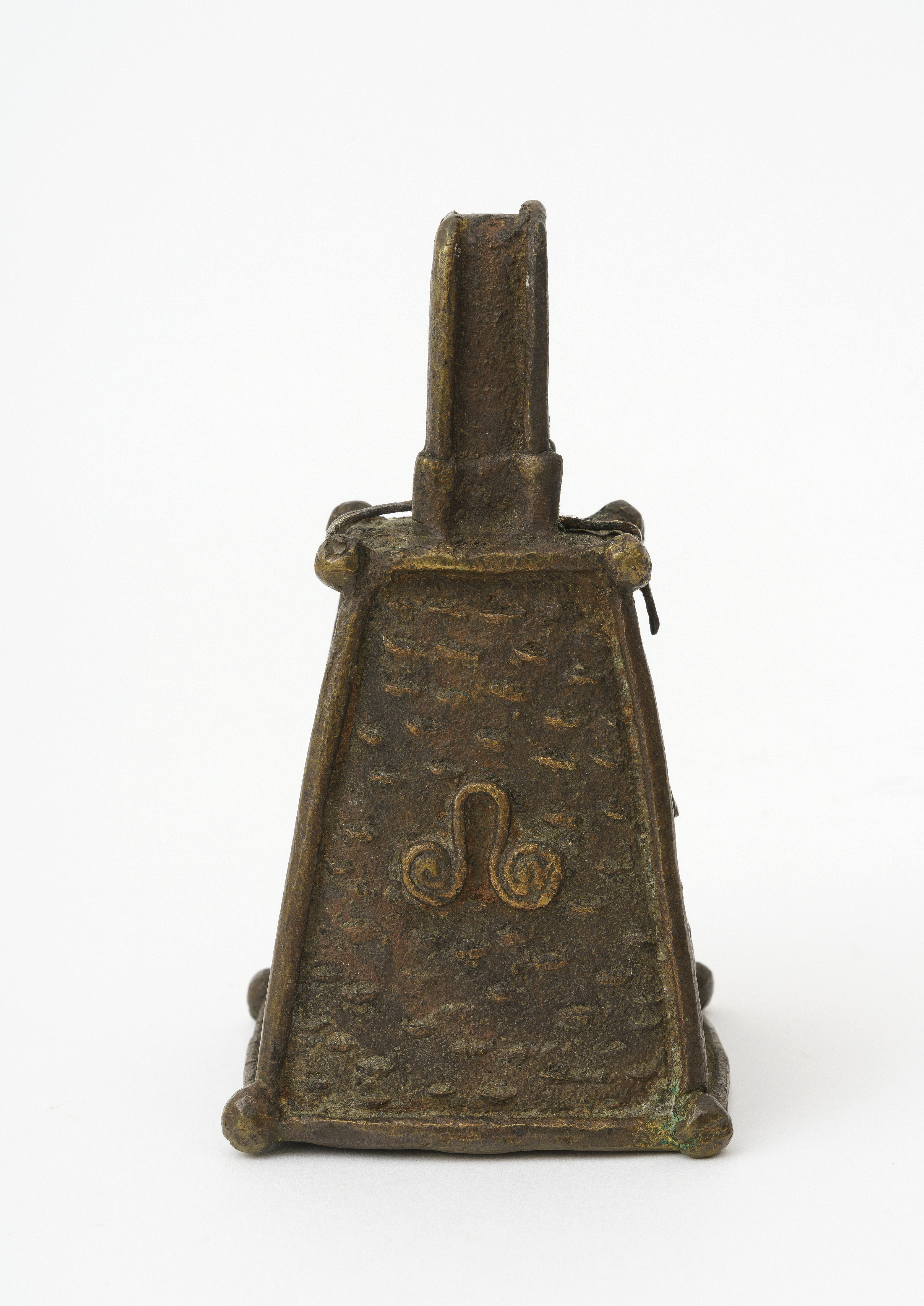 | Description | Strong copper content. Clapper and clasp to hang iron. On one side applied spiral clasp, otherwise diamond mesh. Back side without ornament. Casting defects esp. inside. |