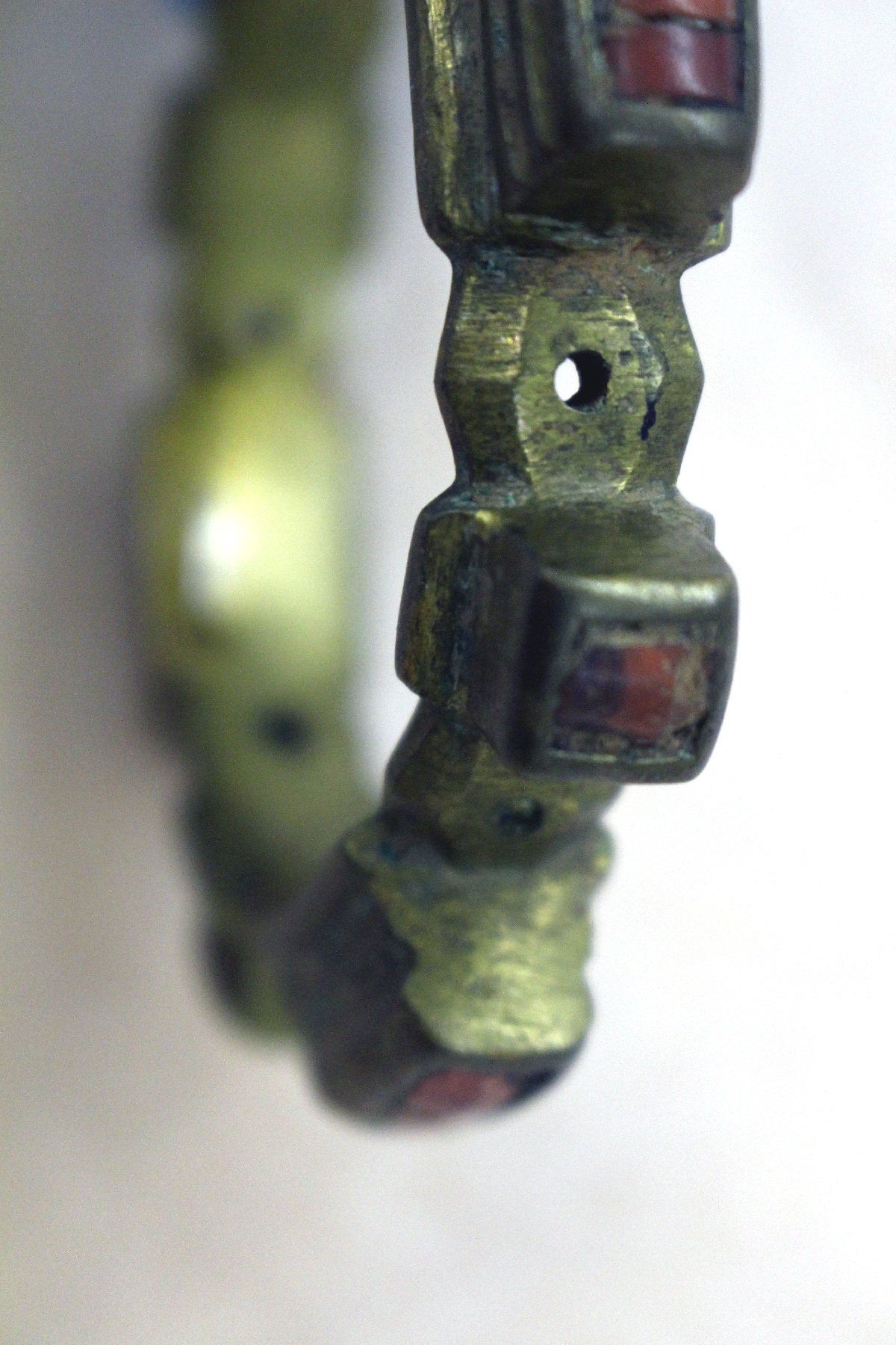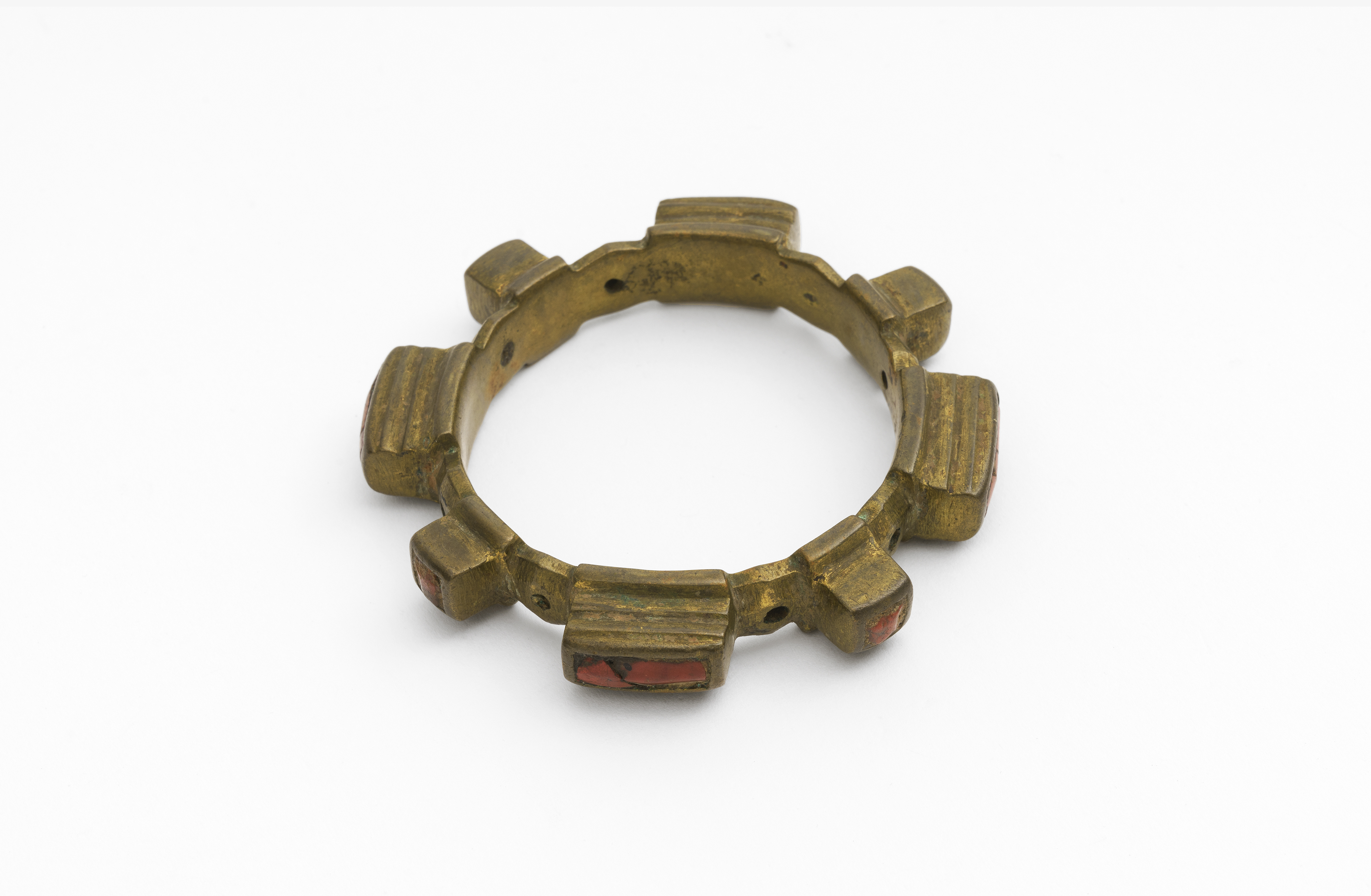 | Description | Carved all around, in rows, offset against each other, alternating Portuguese heads (?) and eben sword. Medium patina bracelet with 4 large and 4 smaller rectangular bosses, in each 1 red stone as coral imitation. In the intermediate fields 1 hole each. |