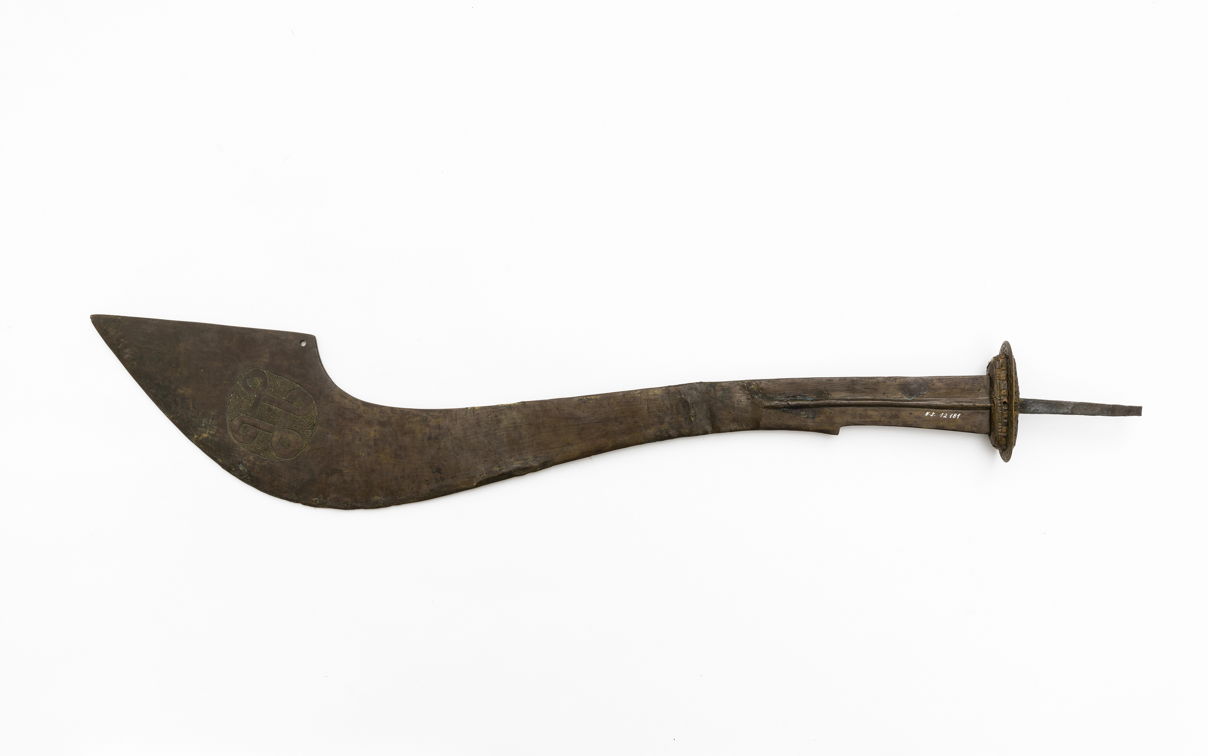 | Description | Curved blade, iron, covered with copper sheet, engraved circle with knot ornament. Same ornament on both sides. Handle incomplete, copper overlay broken. Damaged overall. Restoration: Heinrich Scheich "Art forms crucial to status differentiation and religious worship are attributed to Ogiso times, particularly ... the ceremonial sword (ada) .. (14) In Ogiso times the iron ceremonial sword called ada was part of the furnishings of the ancestral altar, where it expressed the power of the ancestors to control the course of events. The Edo believe that iron has the mystical power of ase to insure that whatever proclamations are made will come to pass. In the second dynasty the obas took to making public appearances accompanied by pages carrying the ada, thereby incorporating an ancient Edo sanction into the new royal symbolism. (15). Zu Abb. 11: The ada is carried by pages emada during the public appearances of the oba. It symbolizes his right to take human life. The oba delegates the ada to high ranking chiefs, who may have it carried alongside them in their own domains but not in the palace. 15./16.Jh. "Specific objects, such as ada were sent to vassal lords as emblems of their authority." (18) As an abstract concept Ogun represents the force inherent in metal, a mystical power with the potential to create or destroy. In this capacity, Ogun cannot be artistically represented, except indirectly through those objects in which the power of metal resides, such as ceremonial swords or proclamation staffs. (51) LIT Kat Pitt-Rivers 1976: pl. XVIII, 110 Ben Amos. 1980: The Art of Benin. London |