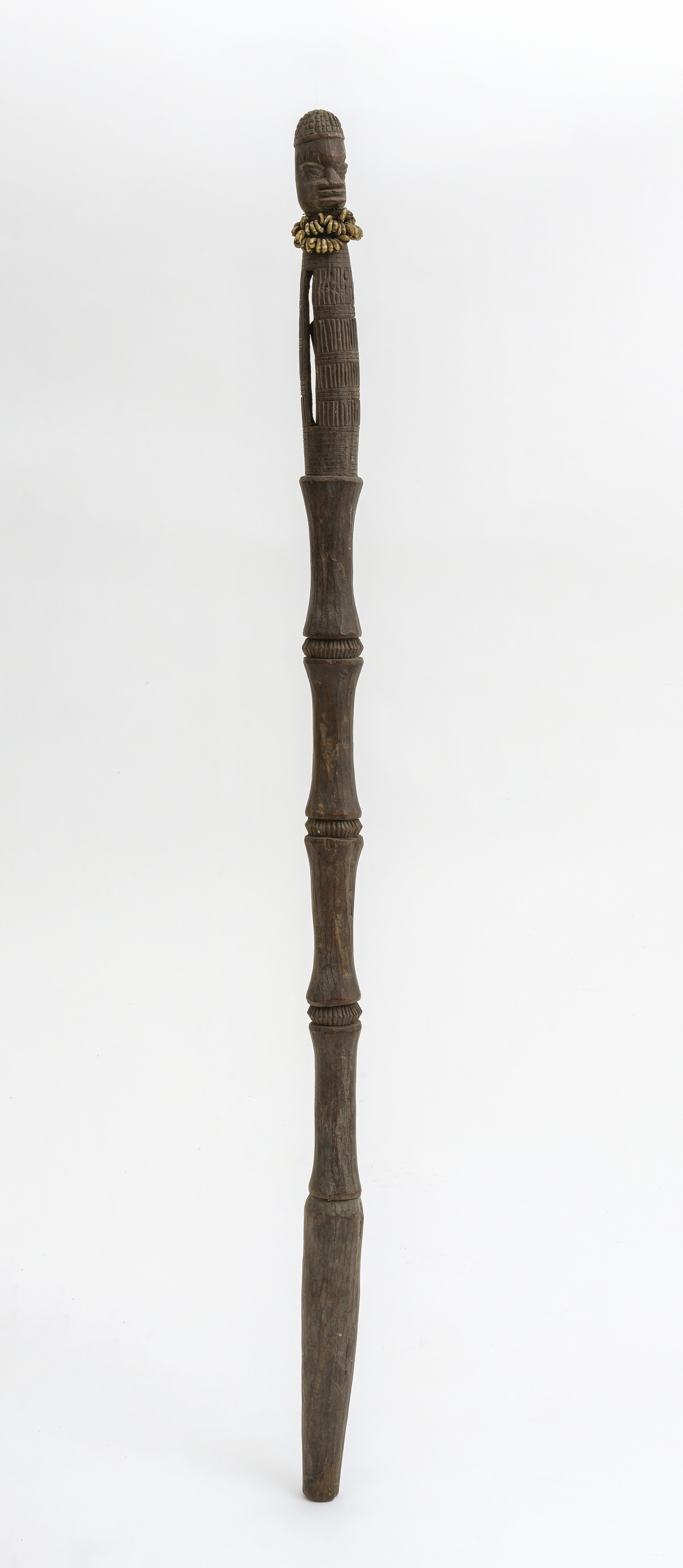 | Description | End anthropomorphic head, below band with cowry body. Then checkerboard hatched fields, slot for rattle body. Bottom 4-fold double conical set off. Purchase price 75.- "The one .. surmounted by a human head, represents generalized ancestors and is for a commoner's paternal ancestral altar (Text zu pl. 58) The rattle staff is both a means of communication with the spirit world, achieved when the staff is struck upon the ground, and a staff of authority, to be wielded only by the properly designated person. In this way it is related to a variety of royal staffs of authority. ... Ideally, these cult staffs are obtained from the urban carvers' guild, igbesanmwan, who are supposed to have a monopoly on their production, but in actuality local village age-grade members often produce them when needed for their own cults. Most village cult shrines consist of these rattle staffs, pots with magical ingredients and pieces of kaolin chalk. (56f) The commoner's paternal ancestral altar is a rectangular platform. Resting upon the wall are wooden staffs uhurhe, with a human head carved on top of each of them. If any predecessor of the present senior son had a title or was a well-known priest, his ceremonial sword, ada, might be found among the staffs. At least one rectangular bell is placed towards the fron, where it can be easily rung to announce the commencement of a service. At the very fron the presence of a celt or "thunderstone" siginifies the sudden and dreadful power of Ogiuwu, the god of death." (60) LIT Ben Amos: The Art of Benin. London 1980, p. 56ff |