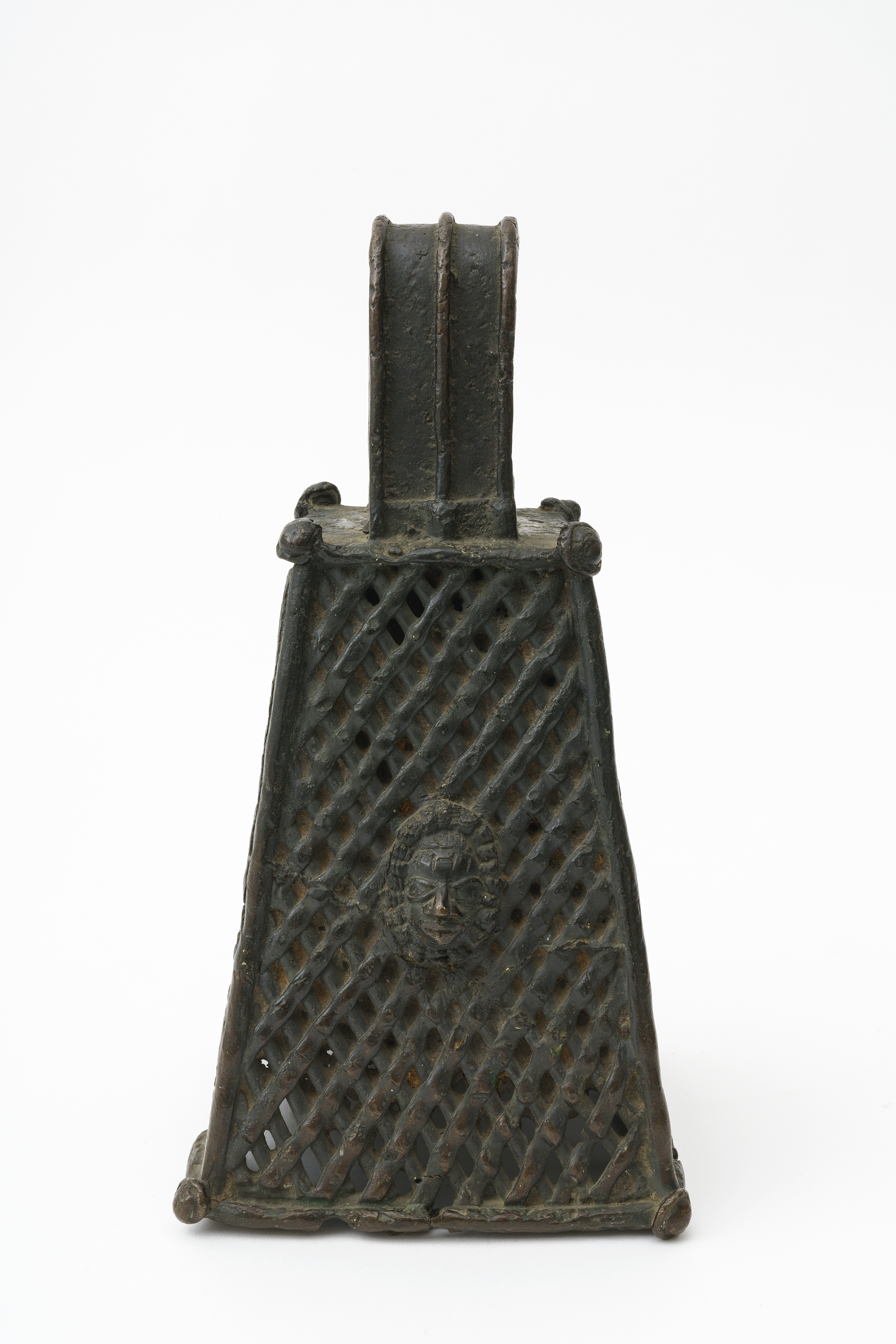 | Description | With clapper. Rectangular cone. Carrying handle. 3 sides with open giter, 1 with face, 1 closed. Probably souvenir, since lattice bells did not occur in classical Benin. |