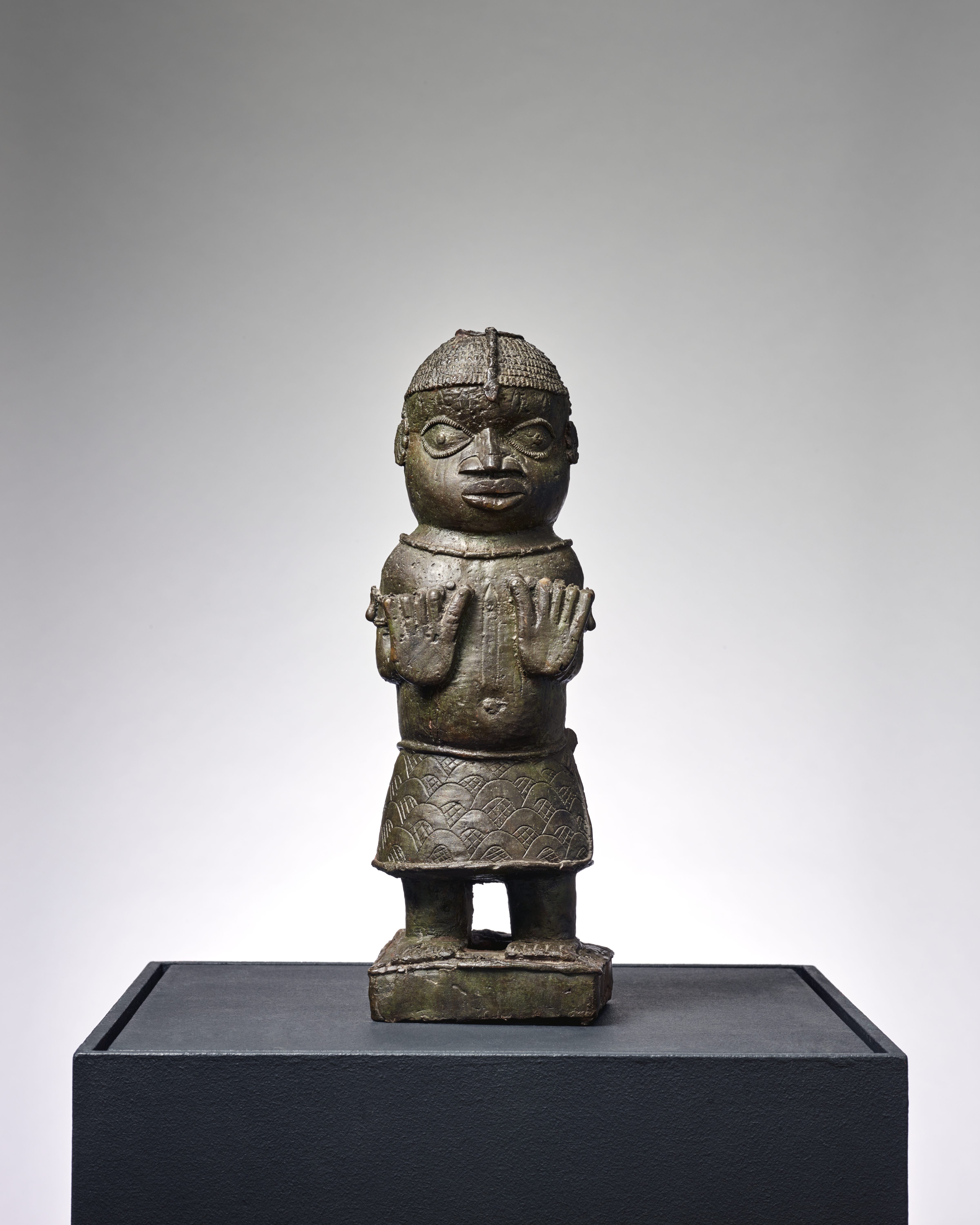 | Description | This fully sculptured figure is almost certainly from an ancestral altar, one of which was located in each courtyard of the royal palace. Depicted is a man in the typical prayer posture, the fingertips perpendicularly aligned to the otherworldly upper world. This motif is taken up in the snake-like form from the fontanel to the forehead. The strict lateral symmetry stands for order and harmony. The rigid, immobile posture as well as the wide-open eyes represent a sacred state of calm and balance, close to the ancestors. Text: Dietmar Neitzke. |