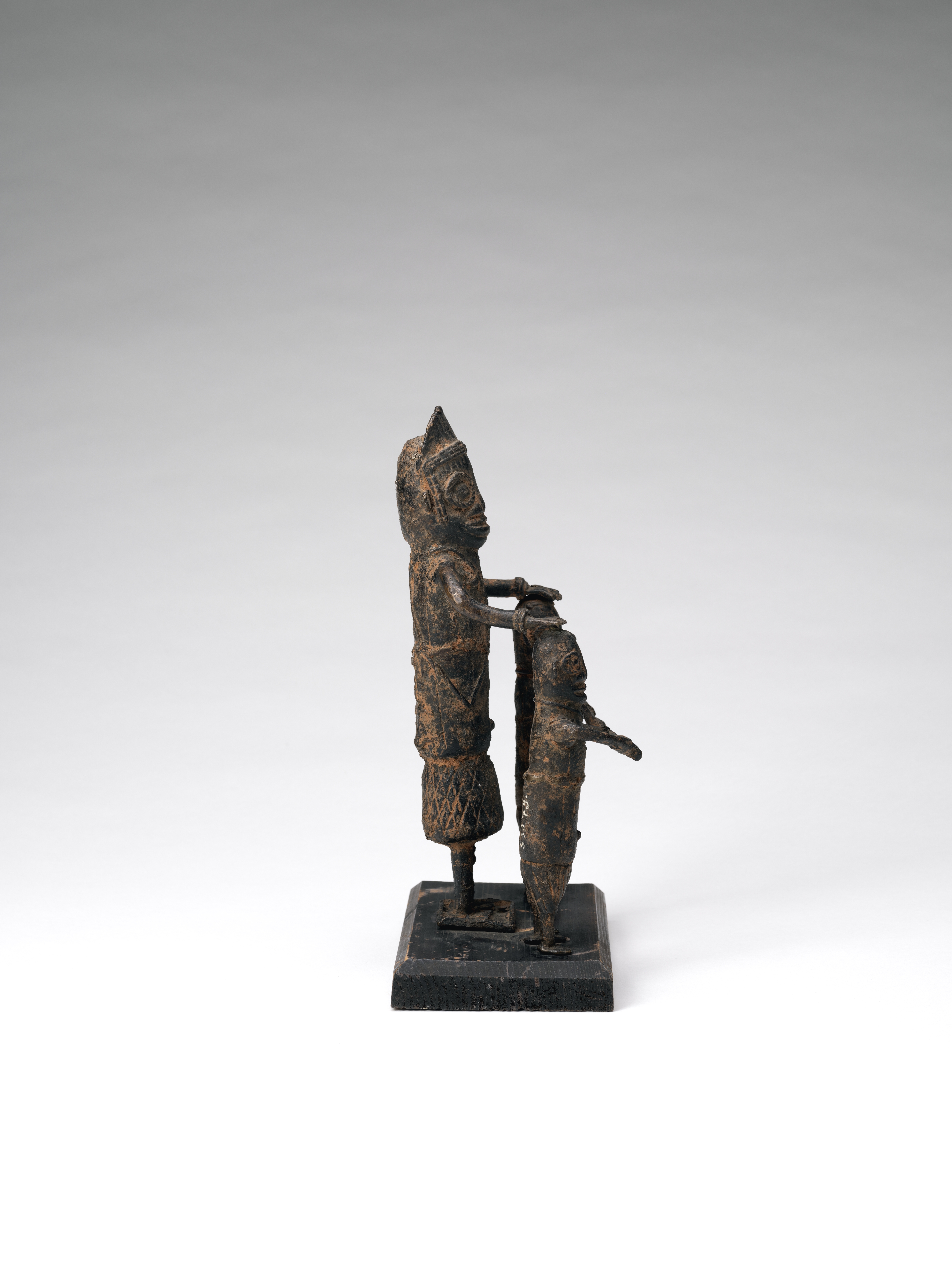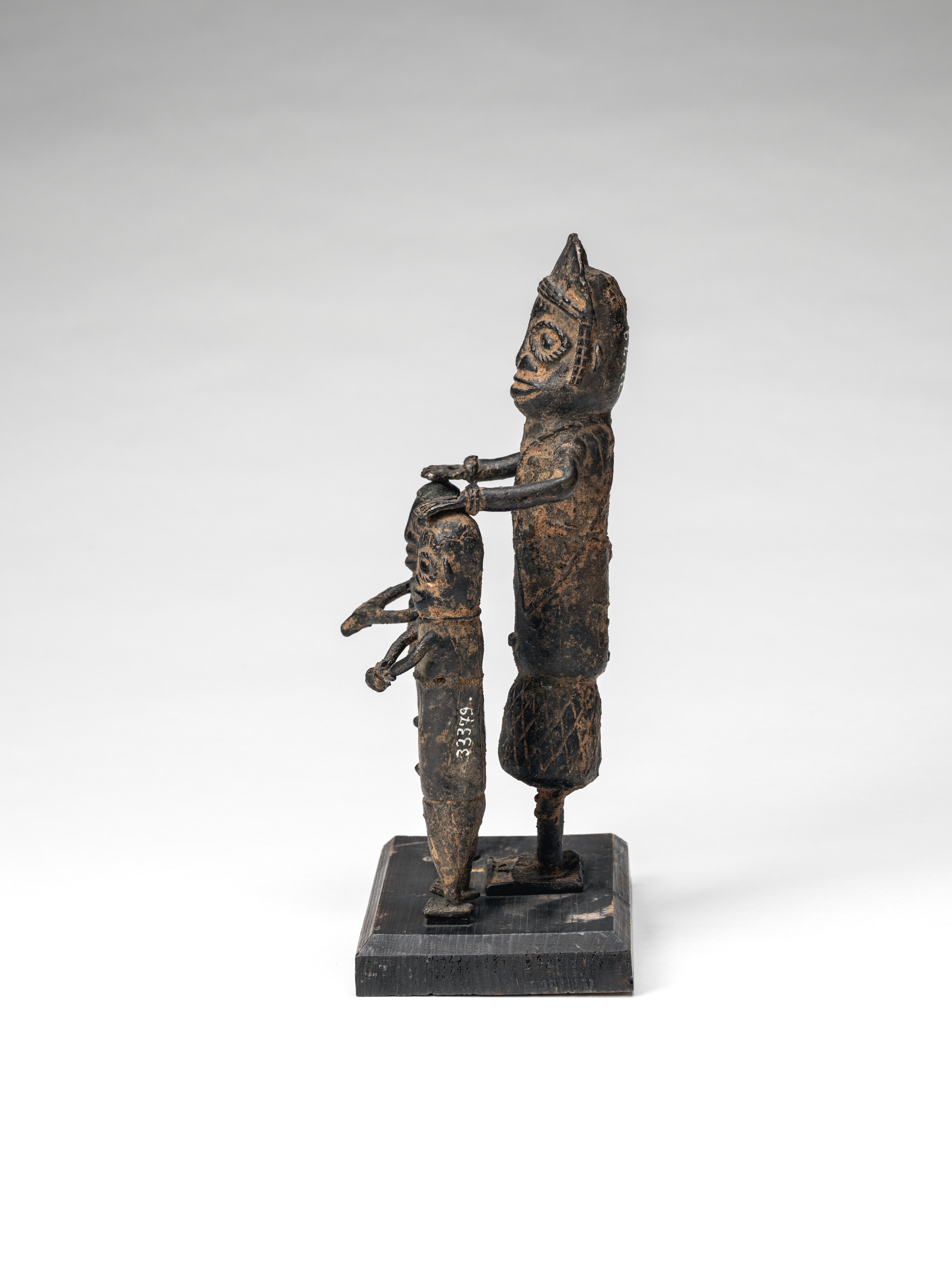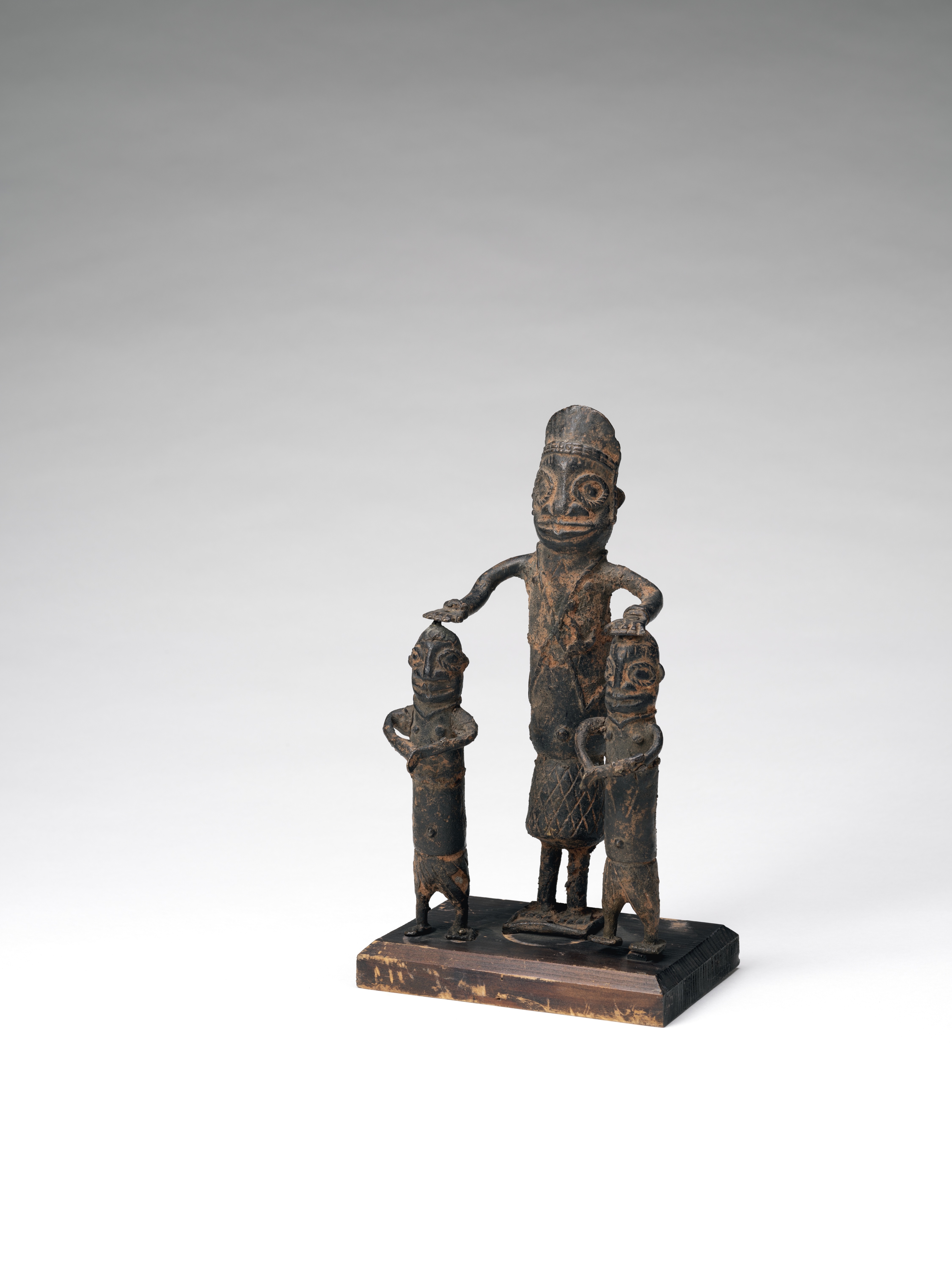 | Description | This group of figures shows one larger and two smaller male figures. The latter do not necessarily have to be interpreted as children, since the art of Benin often represents status through size. This is also supported by the fact that the larger figure wears significantly more beaded jewelry, and is thus to be addressed as a dignitary. Conceivable is a sacrificial scene, which was represented with such figures again and again. Especially from the 19th century, Europeans increasingly report human sacrifices, often by decapitation. The hand of the dignitary rests on the head, the spiritual and personal essence of the other two men. The highly stylized faces, overall poorer craftsmanship and casting quality with a rough surface also argue for a dating to the late period (1840 onwards). Text: Dietmar Neitzke. |