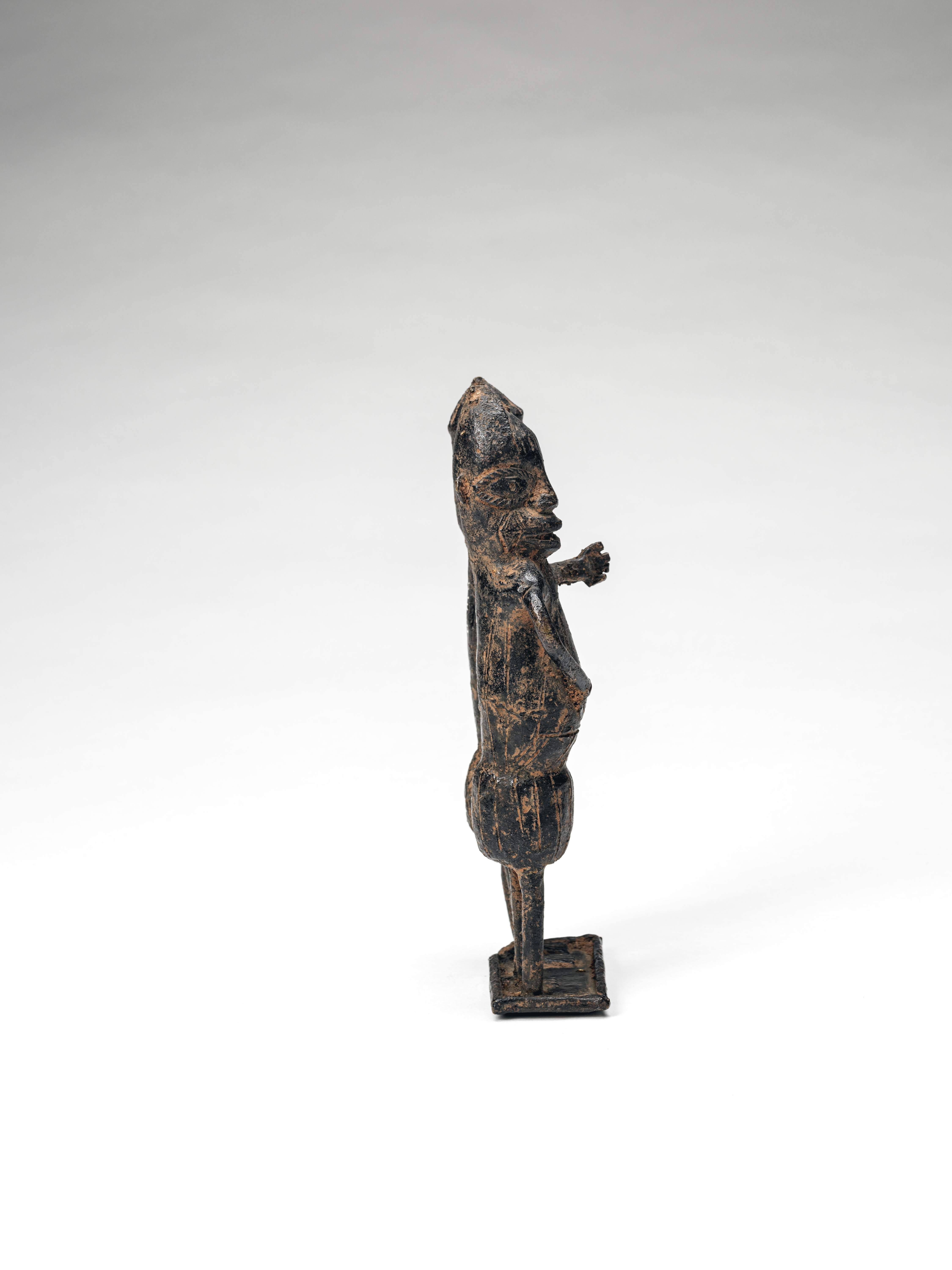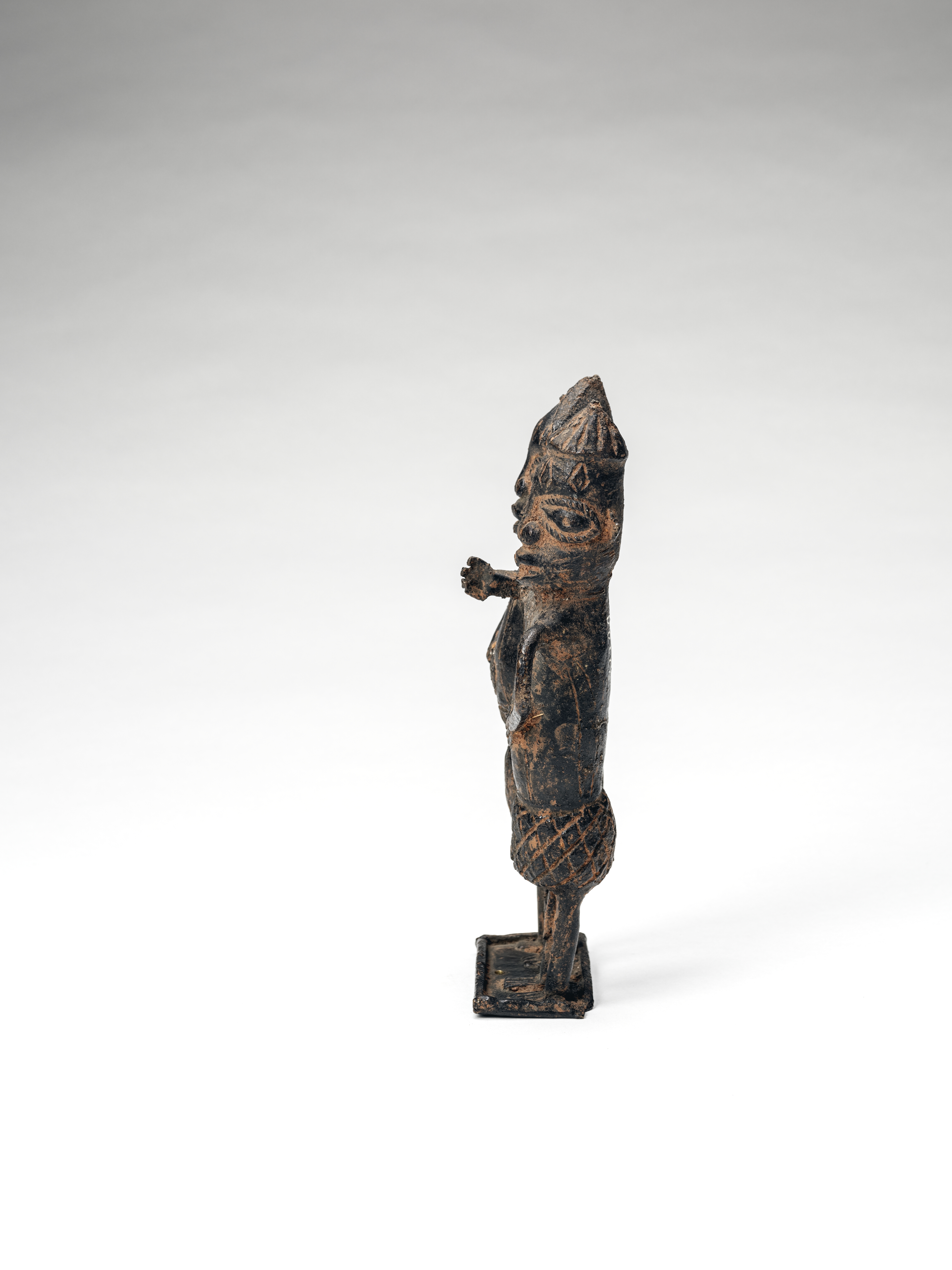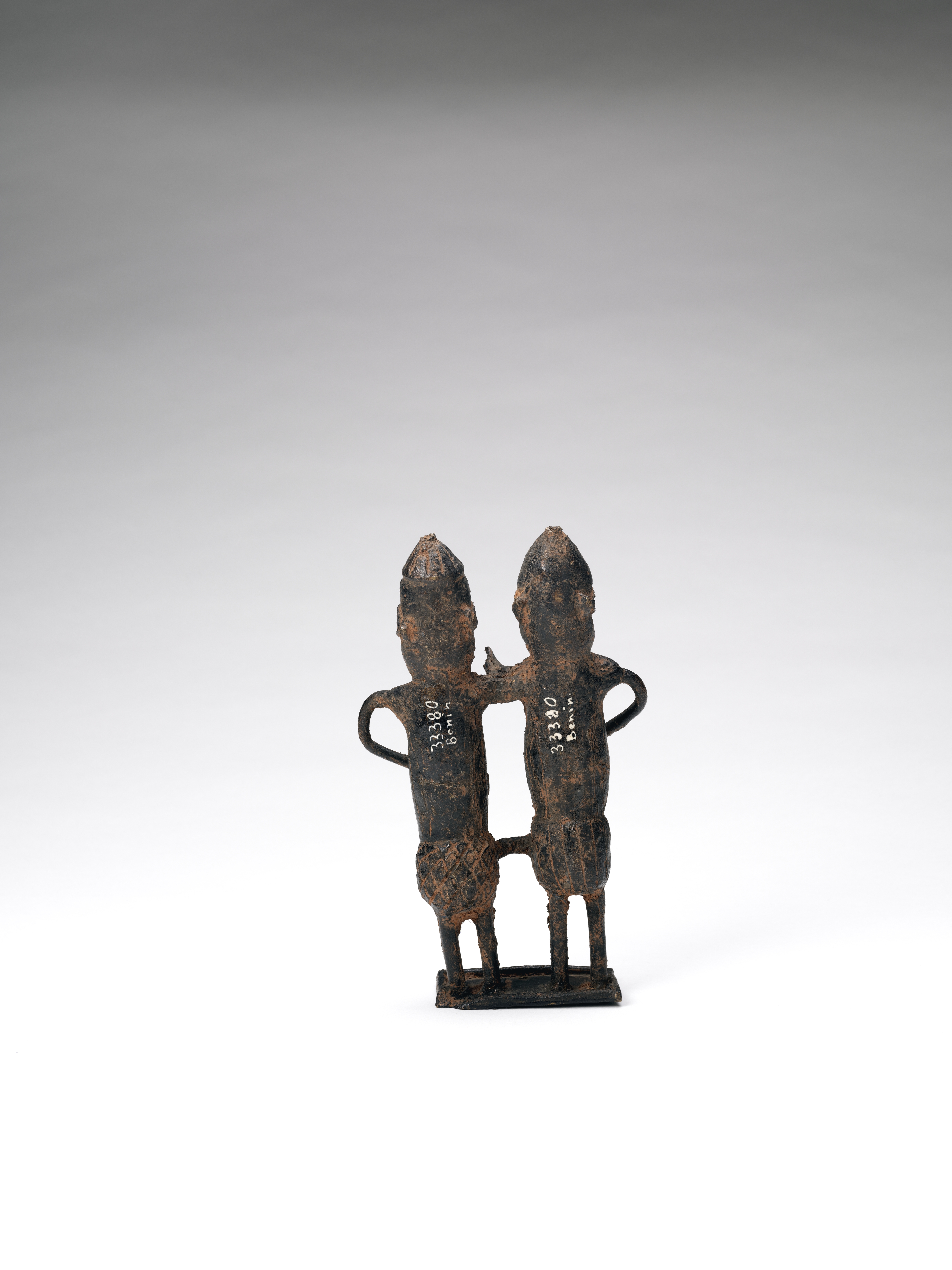 | Description | The group of figures shows two men standing next to each other and embracing. They wear decorative scars on their foreheads, but hardly any jewelry, so they are not to be addressed as high-ranking dignitaries. The stylized faces as well as the poorer quality of craftsmanship with a rough surface speak for a production in the late phase (after 1840). Perhaps it is a part of a larger scenery. In their "bronzes" the kingdom recorded important events for posterity, e.g. ruler's deeds, war campaigns or ceremonies and sacrifices. Thus, not only sacred relics were stolen, but also evidence of collective memory in a society without writing. Text: Dietmar Neitzke. |