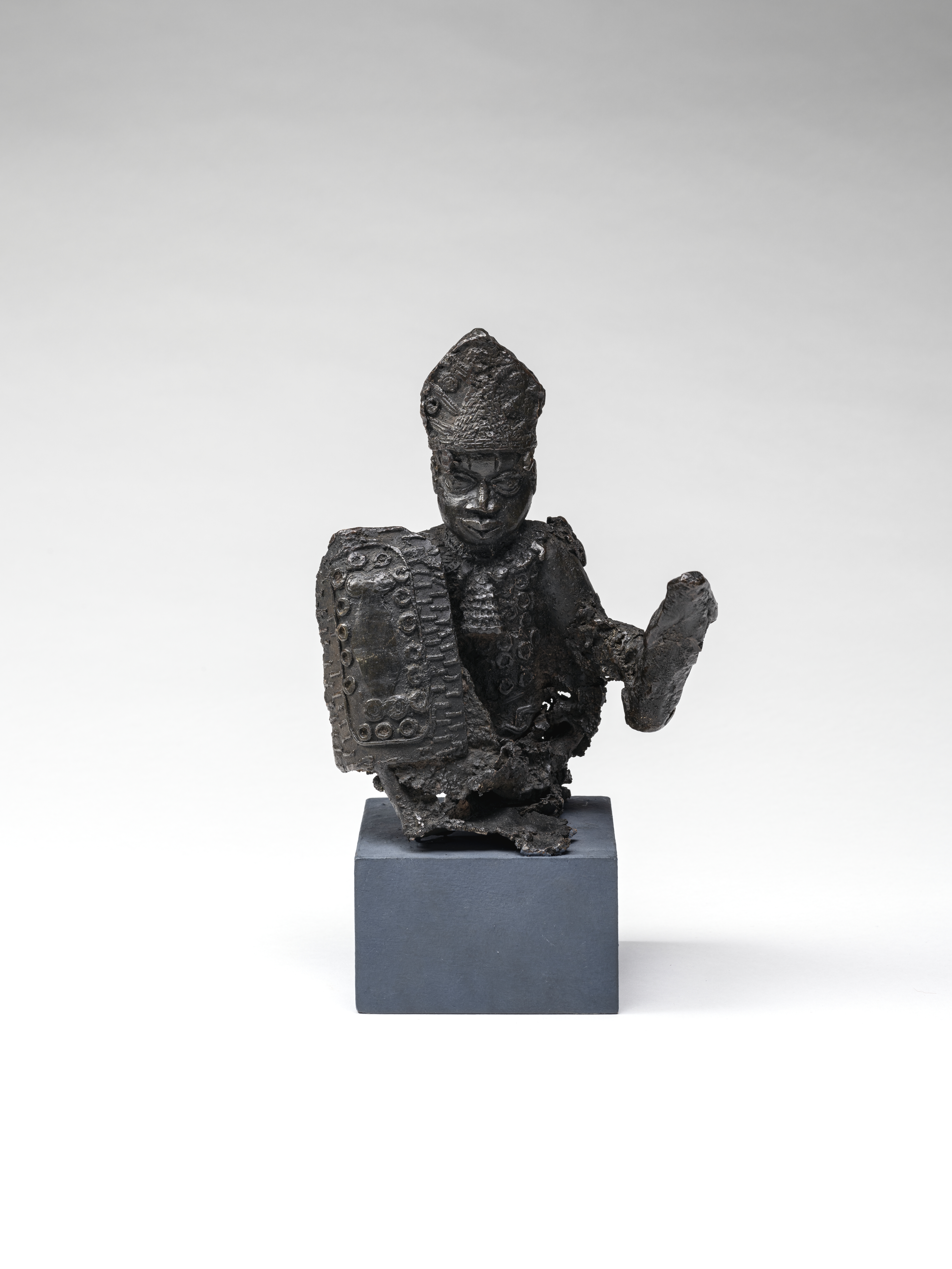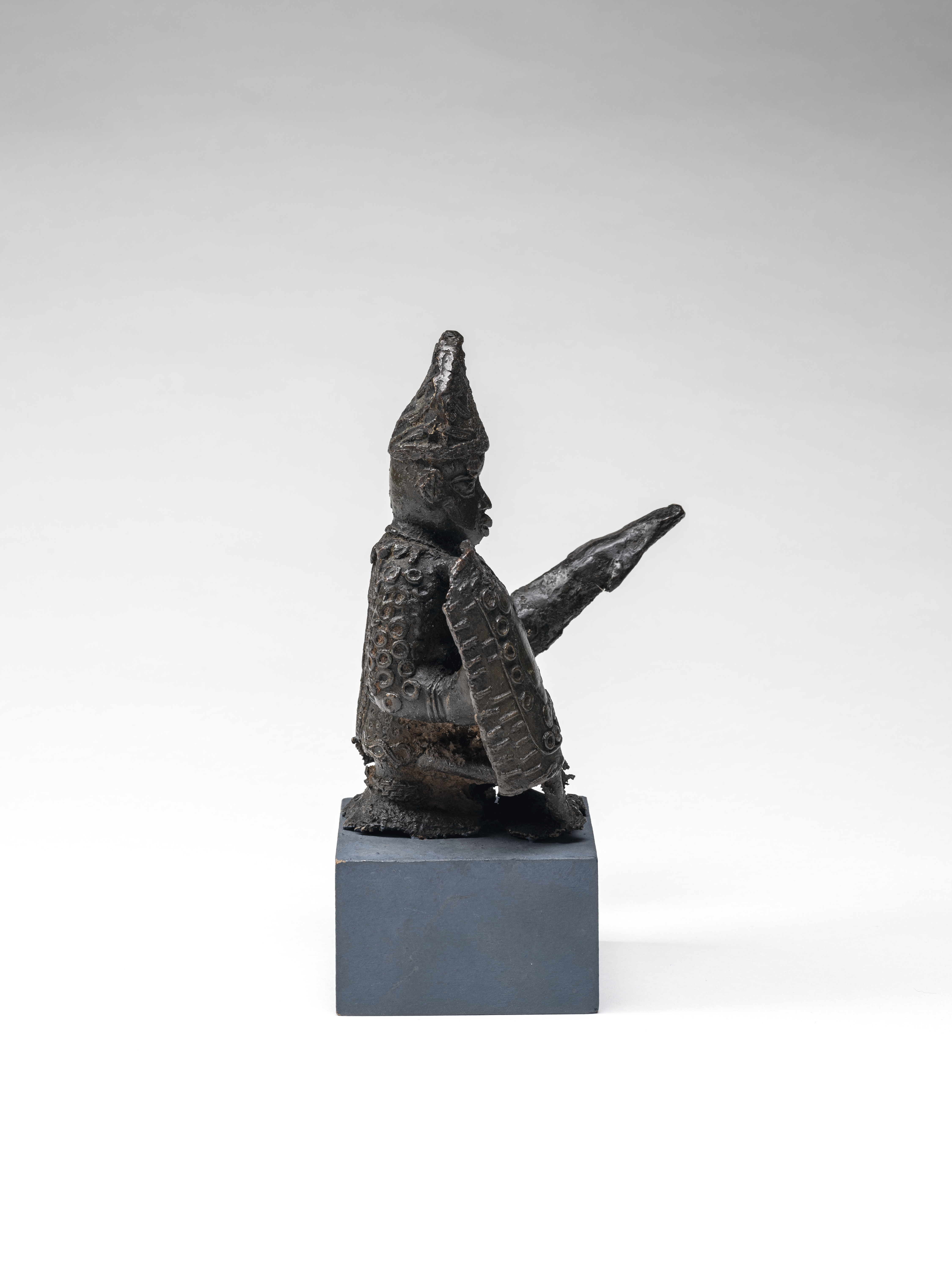 | Object Name | Copper alloy sculpture of a man wearing a headdress and holding a spear and a shield |